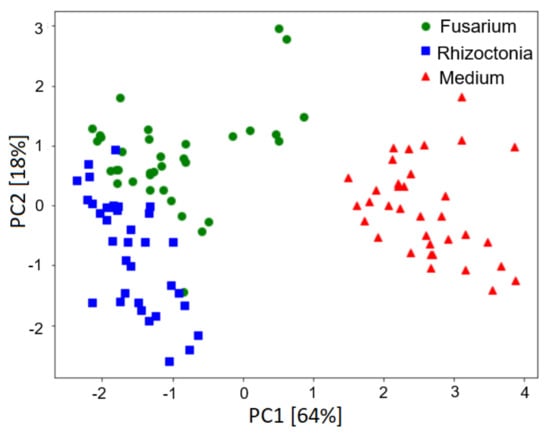 As one can observe in the following figure, there is a clear distinction between samples infected by fungi and non-infected samples containing only the growth medium. Additionally, we can notice that the separation between medium only and Rhizoctonia samples is larger than the separation between medium only and Fusarium. This may indicate that the classification models detecting Rhizoctonia perform better than the classification models differentiating between medium and Fusarium samples. In addition, we can observe that differentiation between the two studied species of fungi F. oxysporum and R. solani may be more challenging, as the data distributions for these samples are not totally separated and have a small overlapping region. As we present in the next section, such intuitive observations about the classification performances are confirmed by the accuracy measures based on the PCA visualisation.