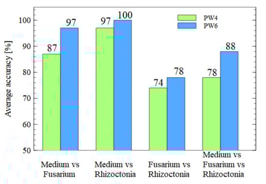 As one can notice, in most cases, we achieved better accuracy performance when the heater voltage was lower than the nominal one. In the case of differentiation between medium and Fusarium samples, the difference was in the order of six percent, which considering the number of data points, is equivalent to two more samples being correctly classified. The highest increase of the classification accuracy was observed for the multinomial classification when the classification of all categories was attempted, and the increase was in the order of nine percent, which is equivalent to about five samples.
