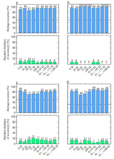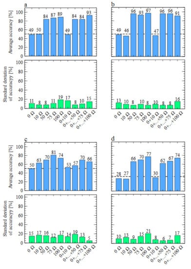 In Figure 7 we present the results of model performance using the data collected by the TGS 2602-type sensors. As one can notice, in this case, we could not obtain good differentiation between the studied odours when sensors were working with the heater voltages recommended by the manufacturers. However, the models’ performances significantly improved for much lower voltages when resistors of 75 and 100  were used. When we refer to the data presented in Table 2, we can notice that these resistors performed ideally when the sensors’ heater voltages were at most half of the nominal ones.