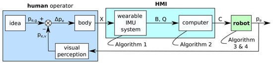 The developed system is a position control system with a feedback loop, as shown in Figure 1. The controlled position is the position of a useful reference point on the robot’s end effector (e.g., a point between the contact points of the gripper). A well-defined end-effector reference point is important because it has to be easily recognizable by the human operator.