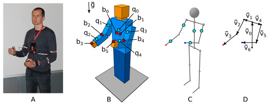 The corrected orientation quaternion changes are used to set the model vectors v of the operator’s upper body in the corresponding position , as shown in Equation (5), where .