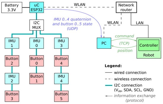 The wearable IMU system shown in Figure 2A is the first part of the Human–Machine Interface (HMI) of the developed system. The IMU system has a modular structure and consists of 5 IMUs, 6 buttons, a microcontroller with wireless capability and a battery power supply.
