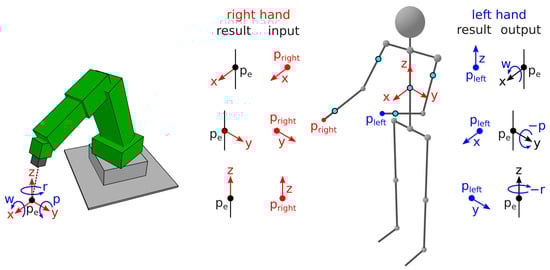 The listed goals greatly constrain the design space of the robotic teleoperation system. Firstly, because the robot is used to manipulate an object in a structured industrial environment, the human operator is primarily concerned with the position of the robot’s end effector in Cartesian space. If the robot arm were fully anthropomorphic, the change in the operator’s joint positions would be easily transformed to the robot’s joint positions, and the position of the hand/end effector in Cartesian space would be preserved. However, this is not the case, because the industrial robotic arm differs from a human arm in its joint types, link lengths, and range of motion. Therefore, the robot should be controlled in Cartesian space instead of in joint space. The positions of the robot joints are not directly controlled by the operator but are calculated by the robot’s controller with the use of inverse kinematics.