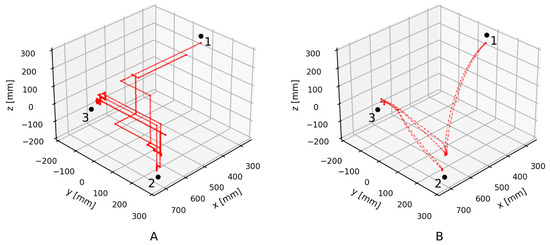 Firstly, the robot is controlled manually by an operator using a teach pendant. The teach pendant has a size of 340 × 200 × 70 mm and weighs 1390 g. The operator holds the teach pendant with one hand, which is also pressing the dead man’s switch, and presses the command keys with the other hand. The robot moves according to keypad presses and a set movement speed. The operator controls the robot in Cartesian space, one axis at a time. The robot path shown in Figure 7A is consequently constructed of straight perpendicular segments that have stationary points between them. The robot only moves when a control key is pressed and therefore halts between key presses. Smooth movement in multiple spatial dimensions can only be roughly approximated using short alternating movements in different directions. This type of motion is used to insert the workpiece in the fixture at point 3. However, precise movement in more than one dimension is hard to achieve.