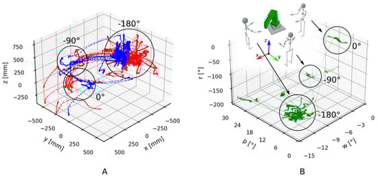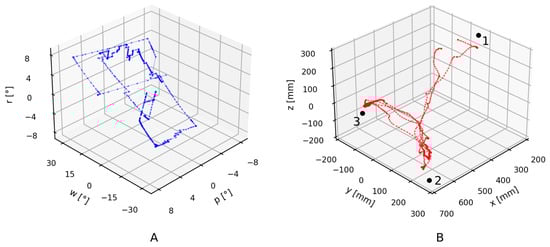 The rotation of the operator’s torso, shown in Figure 8B, controls the rotation of the robot’s coordinate system, that is, the user frame. At the beginning of the evaluation task, the operator stood beside the robot facing in the direction of the X-axis. Their torso rotation around the Z-axis, that is, r, was . Later, the operator moved and rotated around the robot to view it from the side, to the starting orientation, and then moved for the second time to view the robot from the front, to the starting orientation. Rotations other than around the vertical axis (w and p) were considerably smaller and mostly a consequence of changes in the operator’s body posture. However, the operator did not notice their influence during teleoperation.