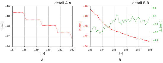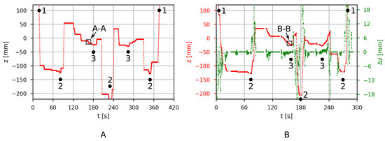 Translation (red) of the robot’s end effector in the vertical direction (i.e., Z-axis) (A) for detail A-A in Figure 10 when the operator is manually controlling the robot with a teach pendant and (B) for detail B-B in Figure 10 when the operator is manually controlling the robot with the developed IMU system. Input (green) for the robot from the developed IMU system is a change in position .