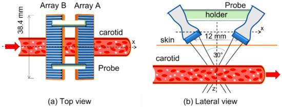 Unfortunately, this choice comes at a cost. The inclination of the two linear arrays is fixed and, thus, the beams cross at a fixed depth. Because of the physiological variability of the carotid depth [22], the beams cross point will not coincide exactly with the vessel center in all of the examined people and, therefore, a measurement error can be produced. However, the reported experiments show no particular performance decrease (see Table 6) in the IV series (where vessel depth is changed) with respect to the series I–III (where the vessel center is aligned with the beam cross point). Since there is a relatively low inter-angle of 30°, the beams run close to each other for a relatively large tract of space near the crossing point and, thus, at the same depth they intercept flow lines with a similar velocity. With the vessel being almost perpendicular to the beams mid-axis, and with the flow being almost laminar, this further reinforces the aforementioned interpretation of the experimental results.