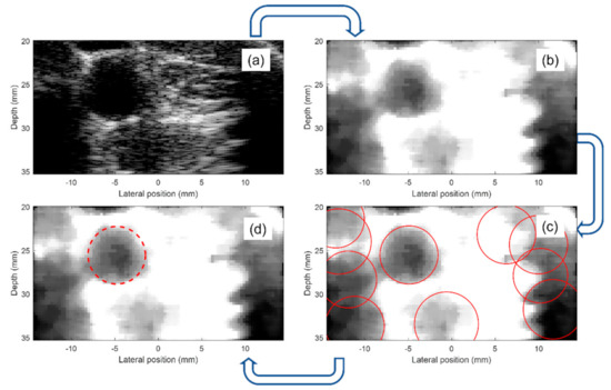 In summary, the algorithm must locate a dark circle in a background of variable grey levels. We developed an algorithm based on the circular Hough transform (CHT) [24], which represents a well-established method for detecting curves and shapes in images [25]. The algorithm proceeds as follows: for each frame of the B-mode sequence (Figure 2a), the image is pre-elaborated to optimize the brightness and contrast. Then, a strong gaussian filter reduces the noise (Figure 2b). Although several thin morphological structures are destroyed in this process, the big artery lumen is emphasized. Then, the CHT detects all the dark circles whose radii are between 2.1–4 mm [26] (Figure 2c). The detected center coordinates (xi, yi) and radii (ri) are collected. For each of the dark circles that have been detected, the brightness values of their pixels are assessed. The circle showing the darkest values is elected as “candidate circle”, and its center coordinates (xci, yci) with radius (rci) are saved in a matrix of candidates. Once all the B-Mode frames sequence has been processed, the matrix holds the results obtained from each image. The most frequent (xc, yc, rc) triad occurring in the matrix is selected as the final choice (red circle in Figure 2d).