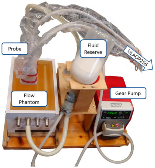 The set-up employed for the in vitro experiments is reported in Figure 3. ULA-OP 256 was connected to the probe composed by the double 128-array described in Section 2.1. The probe was located on top of the flow phantom 524 (CIRS, Norfolk, VA, USA), in a transversal position with respect to the channel under investigation. The phantom includes 2, 4, 6, and 8 mm diameter wall-less channels. In the experiments, the 4 and 6 mm diameter pipes were employed, while the others were excluded because the phantom border was visible in the B-mode image. A programmable gear pump (Watson Marlow, Wilmington, MA, USA) pushed a blood mimicking fluid at a steady velocity in the channel being investigated.