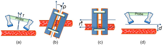 Probe positions tested in in vitro experiments: (a): tilt with −15° ≤ τ ≤ +15°; (b): rotation with 0 ≤ ρ ≤ 20°, (c): lateral translations with random r values; (d): depth with 19 ≤ d ≤ 30 mm.