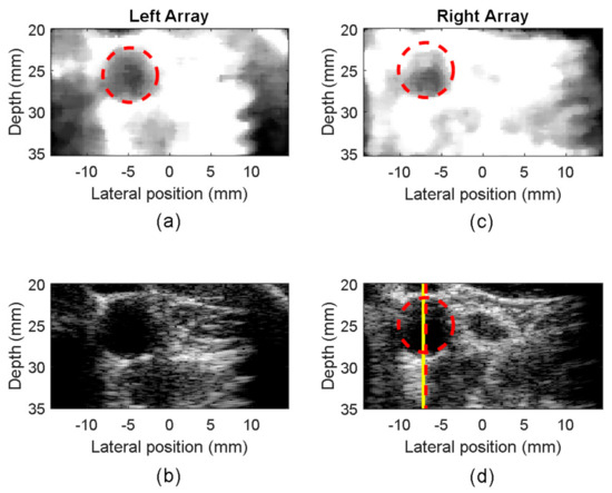 Figure 5 shows, for example, the standard B-mode images (b,d) and the pre-processed images (a,c) obtained from the left (a,b) and right (c,d) arrays during the test running on one of the volunteers.