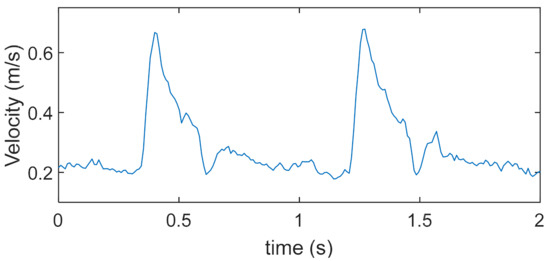 CCA blood velocity measured in one of the volunteers by the proposed method. The 2 s acquisition captured 2 systolic peaks, whose maximum was 0.67 m/s.