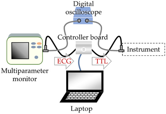 As shown in Figure 1, an Arduino-based controller board (UNO R3 board, ELEGOO Shenzhen, China) was connected to a multiparameter monitor (PM-8000 Vet, Mindray, Shenzhen, China) and to the triggering port of a TTL-enabled instrument. To oversee the conversion, both connections were probed by a digital oscilloscope (PicoScope 2000 series, Pico Technology, Saint Neots, UK) and the whole system was monitored by a laptop (GL63 8RD, MSI, Taipei, Taiwan). To secure the connections, the controller board was kept in a 3-D-printed shell equipped with SMA connectors that were cabled to the input and output board pins. Coaxial cables were used to connect the various units. BNC connectors were used everywhere except at the controller ports. A pair of BNC tees were included to connect the digital oscilloscope to monitor the controller’s input and output signal.