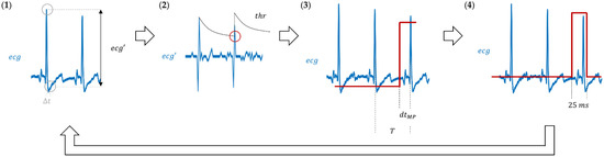 - If and the last R-wave detection was more than 20 ms ago, the -th R-wave was detected. Thus, update the and the values:where is the heart rate period and , are the times (in seconds) for two consecutive R-wave detections.