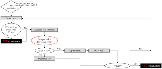 The initial phase of the ECG was established at the point where the ECG derivative is maximum (Figure 2 and Figure 3). At this point, the value of the threshold is set to be equal to the computed estimate of the ECG derivative. At 5-ms intervals, the estimate of the derivative of the ECG is re-computed and compared to the running value of the threshold. If this estimate is below the threshold, the threshold is decreased following a quasi-exponential law; otherwise, the heart rate estimate is updated comparing the current time with the previous time when the threshold was exceeded and the threshold is re-set to the current estimate of the ECG derivative. The trigger condition (Figure 3) is decided upon detection of the proper phase of the ECG cycle. In our algorithm, this is quantified through a parameter () that sets the time between the trigger event and the next prospective maximum of the ECG derivative. This parameter can also be used to take into account instrumentation delays, such as the time between the TTL pulse at the instrument input and the time the measurement is really performed, or delays caused by the ECG monitor equipment. Finally, our algorithm in Figure 3 is set to perform the synchronization on the raising edge of the TTL pulse, so the TTL level has to be lowered shortly after the trigger event (relative to the ECG period). Modification to trigger on the trailing TTL pulse edge is straightforward: it only requires exchanging “high” and “low” in the diagram in Figure 3.