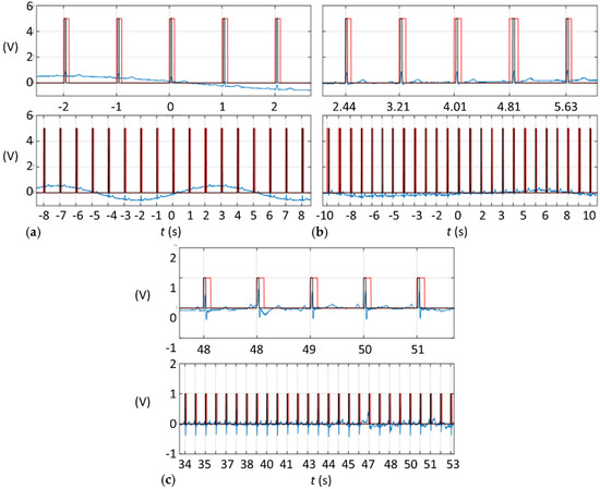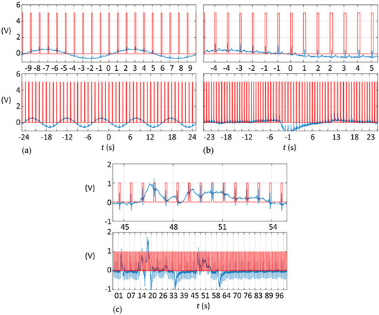 ECG (blue) and TTL (red) signals (a) when adding a sinusoidal wave to the demonstration ECG signal, (b) when using the ECG from a moving human patient, and (c) when using the ECG from an anesthetized swine specimen.