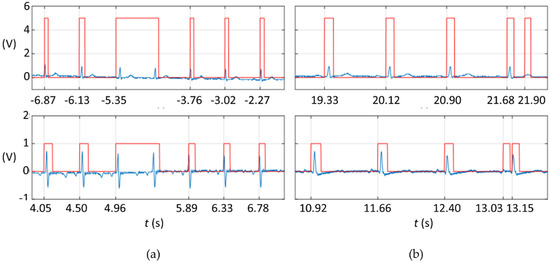 Nonetheless, as detailed in Figure 5a, in vivo with the human patient and the swine specimens, some TTL high states did not become low before the next R-wave, thus omitting it, and resulting in an unexpected type of FN. Nevertheless, the next high TTL immediately after this type of FN did not appear corrupted. Some FP did occur too (Figure 5b). Table 1 quantifies the number of errors that occurred for each trace measured. Traces are chronologically sorted according to when they were measured; note that the error is reduced to zero during the adjustment stage in which the value of was adjusted and minor code modifications were made.