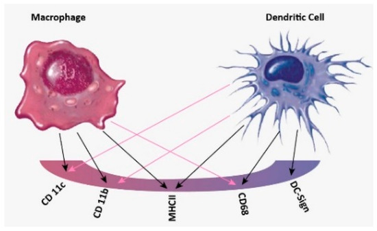Dendritic cells (DCs) and macrophages (MACs) are members of the mononuclear phagocyte system that perform multiple functions during an immune response [1]. Although both DCs and MACs are antigen-presenting cells, they differ in their functions. DCs are specialized in surveillance and the detection of pathogens and, as their name suggests, have elongated structures arising from their body called dendrites [2]. These dendrites increase the surface area of the DCs compared to the cell’s volume [1,3,4]. On the other hand, MACs are mainly involved in the phagocytosis of microbial substances, pathogens, and even cancer cells [5]. MACs also play a significant role in regulating the immune system by releasing cytokines for anti-inflammation [6]. DCs and MACs have been regarded as clearly distinct in terms of cellular function although they occupy overlapping anatomical structures in many body tissues and systems [4]. DCs are stronger in processing antigens and presenting them to the adaptive immune system [7], while MACs are strong in migration to the site at which the pathogen resides and in phagocytosis [8]. DCs and MACs are the key players of the innate immune system as they are the link between the innate and adaptive immune systems [9]. The antigen is captured and processed by these cells and presented to the cells of the adaptive immune system, specifically, the T cells, at specific immunological locations.
