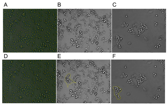 (A) THP-1 Immune cells before differentiation. THP-1 was first cultured in RPMI-1640 media, then differentiated into DCs and MACs. Human monocytic THP-1 cell line (ATCC, Manassas, VA, USA)35 were cultured in RPMI-1640 media supplemented with 10% fetal bovine serum (FBS), 1% sodium pyruvate, 0.01% of mercaptoethanol, and 1% penicillin/streptomycin at 37 °C, 5% CO2, and 95% humidity. (B) DCs and (C) MACs after differentiation, respectively. DCs were differentiated based on the Berges et al. protocol. To induce differentiation rhIL-4 (200 ng = 3000 IU/mL) and rhGM-CSF (100 ng/mL = 1500 IU/mL), rhTNF-α (20 ng/mL = 2000 IU/mL), and 200 ng/mL ionomycin were added to the FBS-free media. For the macrophages, the differentiating and activation protocols of THP-1-derived macrophages were adapted and modified from Genin et al. [37]. THP-1 cells were terminally differentiated into uncommitted macrophages (MPMA) with 300 nM phor-bol 12-myristate 13-acetate (PMA; Sigma-Aldrich, Germany) in RPMI 1640 media without FBS supplement. Afterward, cells were activated for 48 h into pro-inflammatory macrophages (MLPS/IFNγ) by adding 10 pg/mL lipopolysaccharide (LPS; Sigma, USA) and 20 ng/mL IFNγ (Biolegend, San Diego, CA, USA), or into anti-inflammatory macrophages (MIL-4/IL-13) with 20 ng/mL interleukin 4 (IL-4; Bio-legend, USA) and 20 ng/mL interleukin 13 (IL-13; Biolegend, USA). THP-1 cells have a round shape and are suspended in the media, DCs are attached and spread their dendrites in the flask. MACs are also adherent, but without the elongations of the DCs. (D–F) show the selection undertaken in ImageJ software for the calculation of the area of the THP-1, DCs, and MACs, respectively.