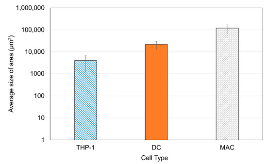 Figure 4D–F shows the detailed selection of immune cells using the software. The software highlights the morphological differences (it marks the outside border of the cell yellow). After the selection of each cell, the software automatically calculates the area of the cell. Results were obtained from three different images to statistically compare the area of each cell. Figure 5 shows a summary of the results. The averages were obtained for measurements conducted on 200 cells of each type. The MACs were found to have the largest area and the THP-1s were the smallest due to their rounded shape. These results are supported by findings in the literature [48,49].