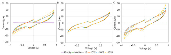 Once optimization was completed, cyclic voltammetry measurements were performed between 0.9 V to −0.9 V, Estep of 0.002 V and Srate of 0.04 s per step using the coaxial cable. Cells were prepared using RPMI full media supplemented with 10% FBS. After the activation process, cells were centrifuged and prepared at different dilutions from 10 to 105 per 500 µL. This was carried out by first counting the cells using a hemocytometer, then diluting them to the necessary concentrations. Data were extracted directly from drop view using the cyclic voltammetry technique. The results exported were current vs. voltage.