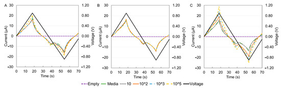 For electrochemical characterization, the DropSens technology was used to obtain the I–V curves for the three immune cells. The results are shown in Figure 6 for different cell concentrations. The current versus time and voltage versus time results are shown in Figure 7. When the positive voltage is applied, the cell suspensions begin to oxidize near the working electrode, this results in an increase in anodic current. This occurs until a peak potential of 0.9 V, wherein a peak anodic current is recorded. After this, a reductive scan is applied, that is, the applied potential is reduced, causing a re-reduction of the oxidized suspension. In other words, the reducing potential now results in a cathodic current (increasingly negative current). At a maximum negative potential of −0.9 V, the maximum cathodic current is recorded (maximum negative current). Although reduction peaks at −0.2 V were observed for all experiments, the regions of maximum and minimum potential were of more interest because the peaks corresponded to the sample concentrations [46]. The peak anodic and cathodic currents had equal magnitude and opposite sign. As the potential is increased positively again, the oxidation and increasing flow of anodic current repeats.