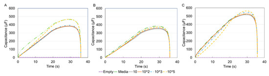 However, since the voltammogram results showed no significant difference within the three types of cells hence, the capacitance was pursued as a means of identification and differentiation. Capacitance measurements have been shown to be a reliable marker for tracking cell surface area and therefore cell size [50]. The graphs of the extracted capacitance are shown in Figure 8.