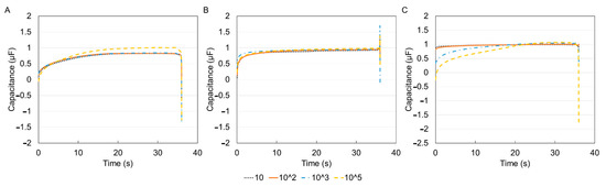 Capacitance–time curve for the three types of cells after media de-embedding (A) THP-1, (B) DCs, (C) MACs. De-embedding was performed by diving each of the concentration values in Figure 8 by their corresponding media value.