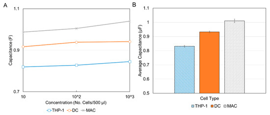 The results showed that the lowest average value of capacitance was for THP-1 (0.83 µF), followed by DCs (0.93 µF), and finally, the largest capacitance was reported for the MACs (1.01 µF). This corresponds to an increasing cell size from THP-1 to DCs to MACs, consistent with the results reported in Figure 6 and in the literature. Although from the results the distinction is possible with only the lowest concentration, the authors recommend the use of the three lowest concentrations used in this paper at a minimum. These concentration ranges are comparable to those used for flow cytometry, for example, Bio-Rad recommends concentrations of 105–107 cells/mL [53].