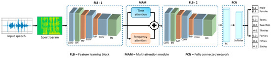 An overview of the proposed age and gender recognition framework. FLB-1—first FLB, which extracts local feature maps. MAM selects the unique characteristics of both time and frequency. FLB-2—second FLB that learns high-level salient feature maps. FCN extracts global features and performs classification. Conv—convolution layer, BN—batch normalization layer, MP—max-pooling layer, FC—fully connected layer.