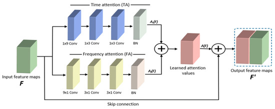 The time attention module exploits the relationship of the particular frequency with the time axis and contains specific frequency-related features at different times. To achieve this, we applied three convolution operations with various rectangular shape filters followed by batch normalization (BN) to the input feature maps F ϵ RH×W×C. The kernel size of the first convolution layer is set to 1 × 9, and the input channels are reduced with the reduction ratio r. The next two convolution layers have a 1 × 3 kernel size and the same input channels. We used BN to normalize and rescale the computed time-attention map. The final time attention map is calculated as follows:
