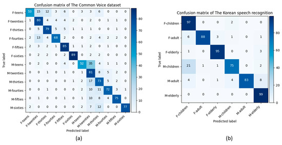 Figure 4 presents the confusion matrices obtained from the model predictions and the test data labels for the age and gender classification problem for the Common Voice and Korean speech recognition datasets. The best class-wise accuracy for the Common Voice dataset was achieved in the F-sixties (89%) and M-twenties (81%). However, the accuracy rates of both the F-teens and M-teens classes were 53% and 52%, respectively. The proposed model confused the predictions of F-teens and M-teens with F-twenties and M-twenties, respectively. One of the main reasons for this confusion is the similarity of the acoustic features such as pitch, the fundamental frequency, and formants of the F-teens and M-teens with F-twenties and M-twenties age groups [9,10]. As our proposed model captures information from the frequency and time of the generated speech spectrograms, the frequency features of the male and female teens group are mostly similar to those of the twenties group. This similarity feature [49] between the female and male gender groups was also observed in the Korean speech recognition dataset. Most M-children were confused with the F-children class in the model prediction. The voices of children are significantly similar for males and females in terms of acoustic features. The highest classification accuracy for the Korean speech recognition dataset was obtained for F-children and M-elderly with a 97% and 99% accuracy, respectively.