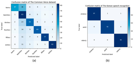 Obtained confusion matrices of the proposed model for the Common Voice (a) and Korean speech recognition (b) datasets for age classification with 72% and 96% average recognition rates.