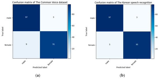 Obtained confusion matrices of the proposed model for the Common Voice (a) and Korean speech recognition (b) dataset for gender classification with average recognition rates of 96% for both datasets.