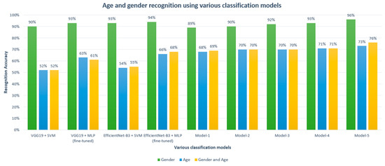 Moreover, we conducted experiments using transfer learning methodology to compare the performance and classification accuracy of our proposed model over other methods. VGG19 [51] and EfficientNet [37] image classification models were used to extract features from the input speech spectrogram, and an SVM [52] was used for classification. We extracted 4096-dimensional feature vectors for each audio file from the second fully connected layer of VGG19 by giving a speech spectrogram as an input image to the model. In the case of EfficientNet, we extracted 1536-dimensional feature vectors for each audio file from the global average layer of EfficientNet-B3 by giving speech spectrogram as an input image to the model. The extracted feature was used to train the SVM classifier with radial basis function (RBF) kernel and regularization parameter of one. Additionally, pre-trained models were fine-tuned for the gender, age, and age-gender classification tasks by replacing top fully connected layers of pre-trained models with our multi-layer perceptron network, which has two fully connected layers with 128 and 64 hidden neurons, respectively. The main reason for choosing VGG19 and EfficientNet pre-trained models for comparison with our proposed model is the similarity of input data to the model. The pre-trained models are very good at extracting useful features from the input image. As our model also uses speech spectrogram as input data, extract useful features, and perform classification task as pre-trained models do, we chose these models as baselines for comparing our proposed model. The same test set was used to evaluate the performance of the trained models. Figure 7 illustrates the accuracy score of various classification models for age, gender, and age-gender recognition obtained using the Common Voice dataset. The gender recognition results were above 90% for all the classification methods, except model-1. However, the age classification and age-gender classification results of pre-trained models were noticeably lower than those of all proposed models. Our proposed CNN model with the MAM mechanism achieved the best results in all three classification problems among the various classification models.