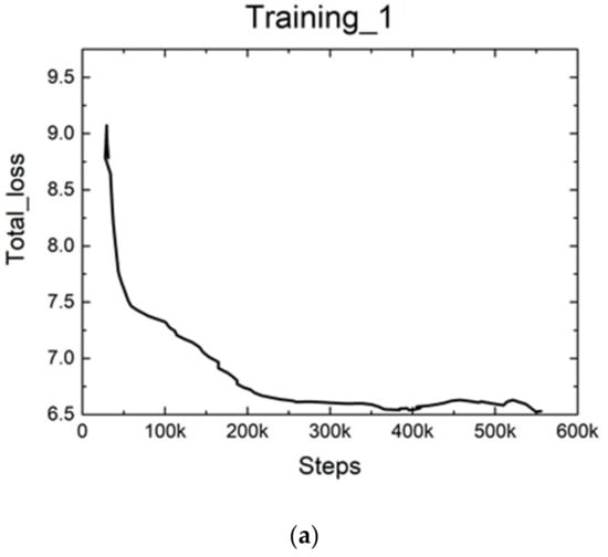 The learning rate was manually adjusted over the training iterations, so that the parameters could converge to the global optimum. In general, larger learning rates were preferred in the beginning and smaller learning rates were used for fine-tuning. The total loss with the training process over steps is shown in Figure 12. In the first iteration, we set the learning rate equal to 0.004, and trained 55.6K steps. The value of total loss decreased quickly at the beginning and slowly stabilized at about 6.5 in the end. Then, we set the learning rate equal to 0.0004 to train 95K steps. The value of total loss stabilized at about 6.13 in the end. Finally, we used the learning rate of 0.00004 to train 60K steps. The value of total loss stabilized at about 6.1 in the end.