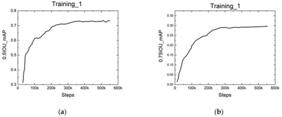 Figure 13 shows the results over the training process. The Intersection of Union (IOU) is defined as the area of intersection divided by the area of union between the predicted bounding box and the ground-truth bounding box. It has been widely used to measure the accuracy of object detection tasks. A value of 0.5 or 0.75 was the threshold we used to judge whether the location of the predicted crack was correct or not. From the results, we could see that the value of mean average precision (mAP) increased quickly at the beginning and slowly stabilized in the end.