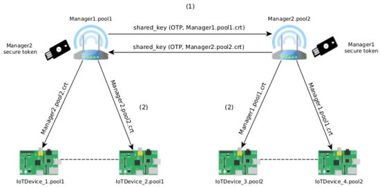 One of the options of this system is the possibility of authenticating pools between them. This option has the advantage of authenticating devices from different pools (for example, in the context of smart cities, between different departments) so that the devices do not need to authenticate between all (1-to-1). For that, if two managers want to merge their pools, they need to authenticate with each other—step 1 in the Figure 2. After this, both pools have their devices authenticated with each other. This option ensures that authentication between devices is the responsibility of managers.