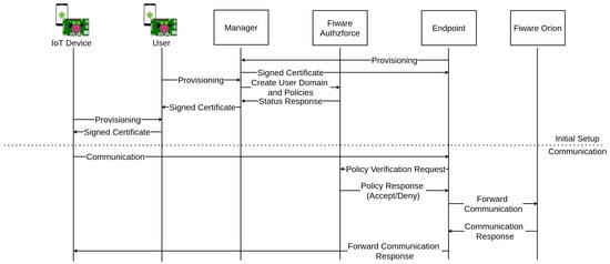 Regarding FIWARE, KeyRock [14] is the component responsible for Identity Management. Using KeyRock (with other security components such as PEP Proxy and Authzforce) enables users and devices to communicate with OAuth2-based authentication and authorization. However, although IoT devices can authenticate with FIWARE with these methods, it is not done for that purpose, as it uses the traditional username/password registration. Even if this type of system is not the most advanced implementation in terms of security and usability, it can still be a good mechanism because it integrates seamlessly with the FIWARE architecture but is more user-oriented. KeyRock also requires a SQL database to store the encrypted user credentials.