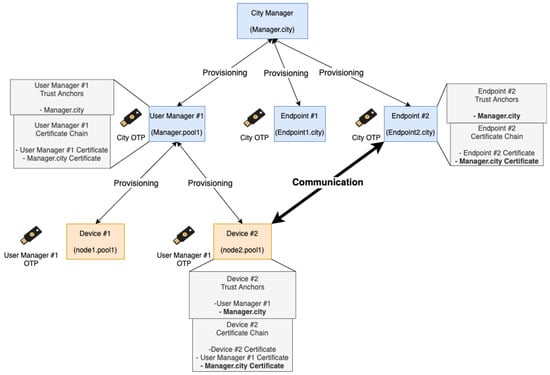 Then, each device updates its list of trusted devices with the certificates of the devices of the other trusted pool—step 2 in the Figure 2. Thus, all devices can verify which devices are trusted. Likewise, and in the presence of a misbehaving device, it is possible to revoke its certificate, and therefore, revoke the trust between devices. Here, the Certificate Revocation List (CRL), which stores the information about the provisioning devices that currently have their certificate revoked, is updated. Only the manager can revoke devices of the pool managed by it. This list is shared between pools when there is authentication between them.
