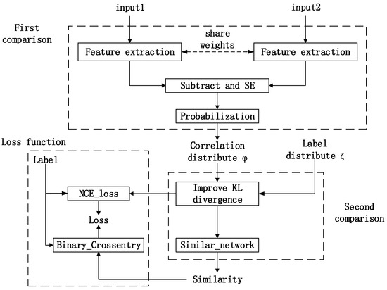 The overall architecture of the network is shown in Figure 3. In our architecture, there were two different comparison parts. The first part was to compare the original image with matching images. The second part was to compare correlation distribution φ with label distribution ζ. The first part aimed to find correlation of inputs and generate the correlation distribution φ. The second part aimed to calculate the similarity by correlation.