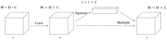 SE unit. W represents the vector width. H represents the vector height. C represents the number of vector channel. The input x is convolved to obtain the feature u. The weight is generated by compressing u into the channel dimension through the squeeze process. Finally, the weighted feature y is obtained by multiplying the weight by the corresponding channel.