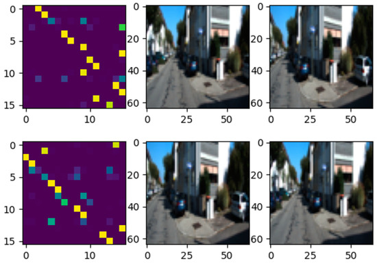 Correlation distribution φ and input image: top, φ with identical input images, and the output from the similar network is 1 × 10−6; middle, φ with similar input images (difference between 5 frames), and the similar network output is 0.653; bottom, φ with completely different input images (difference between 50 frames), and the similarity is 0.998.