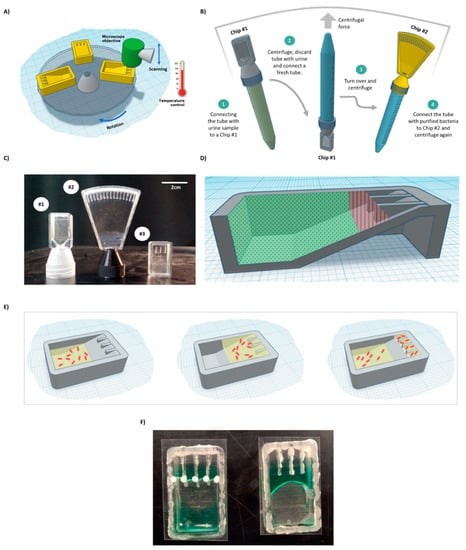 The current work presents the concept of a device (Figure 1A–E) that combines a microscope, a centrifuge, an incubator, and microfluidic chips for the semiautomatic processing of urine samples suspected to be carrying infectious bacteria.