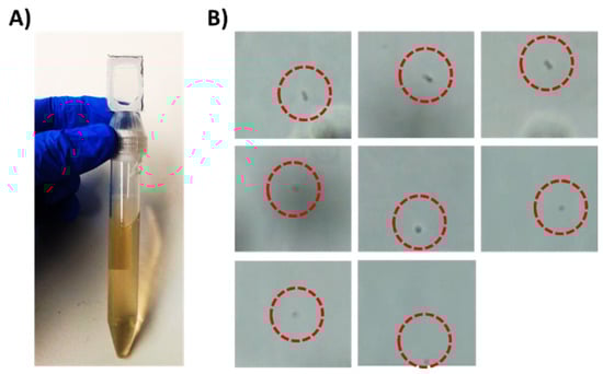 Detection of 5 × 103 E. coli cells/mL in a liquid sample as a model for UTI diagnostics. (A) A 15 mL tube with Chip #1 attached to it. The tube holds 10 mL sample spiked with E. coli cells. (B) Trapped bacterial cells as observed under a brightfield microscope equipped with 60× objective after centrifugation.