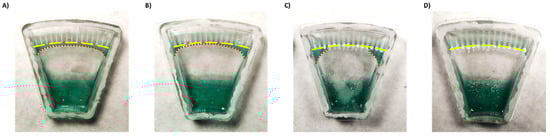 Demonstration of liquid backflow and channel separation after centrifugation of a chip (A) without coatings, (B) with a hydrophilic coating only, (C) with a superhydrophobic coating only, and (D) with both hydrophilic and superhydrophobic coatings. Yellow lines indicate channel entrances. Red lines—excess liquid.