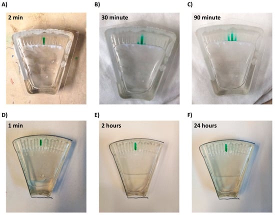 Thus, a combination of both hydrophilic coating and superhydrophobic coating was applied. This approach enabled full and spontaneous backflow of the medium and effective complete separation between the channels in both Chip #2 and Chip #3 (Figure 1F and Figure 3D; Supplemental materials: Videos S3–S6). A green food color drop-dried in the coated channels remained in the channel, even after a 24 h incubation (Figure 4D–F and Figure S6A), while in the uncoated chip, the color diffused out within less than 30 min (Figure 4A–C and Figure S6B), indicating efficient separation of the channels when the coating is applied. Moreover, these results also propose that dried antibiotics inside the channels will not have enough time to diffuse out of the channels during the short centrifugation stage.