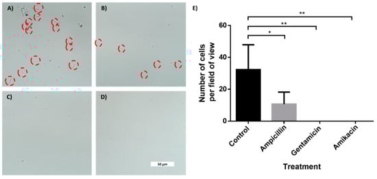 In-chip antibiotic sensitivity testing of an E. coli-spiked sample. Brightfield microscopy photos of E. coli cells taken with 60× objective after 2 h of incubation. The cells were incubated inside microchannels with an entrance coated with a superhydrophobic coating. (A) Control channel. Channel with drop-dried (B) ampicillin, (C) gentamicin and (D) amikacin. (E) Manual cells count per field of view (690 μm × 300 μm) using a 20× magnification. n = 3. Error bars indicate standard deviation (SD). * P ≤ 0.05, ** P ≤ 0.01.