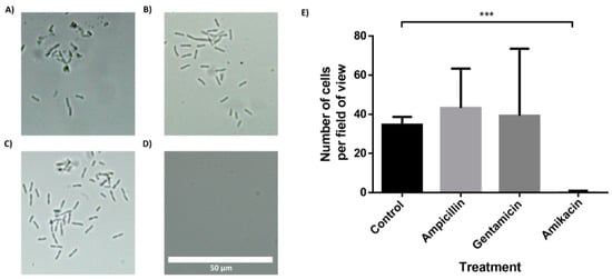Antibiotic susceptibility testing of Klebsiella pneumoniae, isolated from a clinical urine sample. The multi-channel chip with superhydrophobic and hydrophilic coatings was loaded with a K. pneumonia in LB and incubated for 2 h. (A) Control channel. Channel with drop-dried (B) ampicillin, (C) gentamicin and (D) amikacin. (E) Manual cell count per field of view (235 μm × 100 μm) using a 60× magnification and a brightfield microscope. n = 3. Error bars indicate standard deviation (SD). *** P ≤ 0.001.