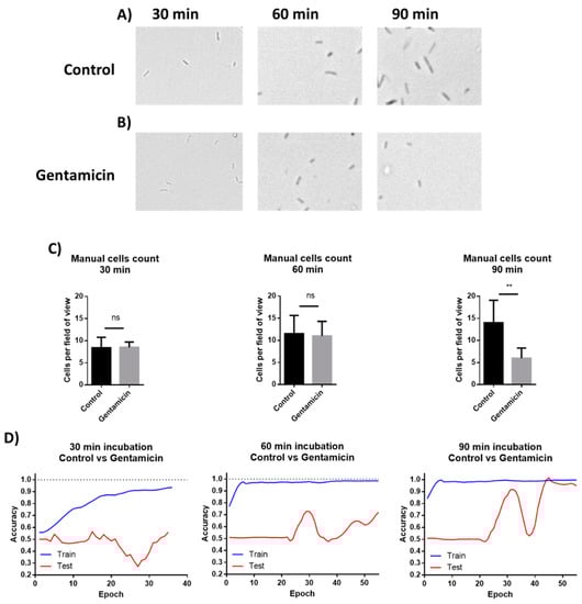 The images from the AST discussed above were manually analyzed. However, deep learning models can be applied to process visual data. To demonstrate the possibility of using machine learning (ML) for AST analysis, E. coli cells were incubated in LB inside a 48-well plate containing drop-dried gentamicin. The wells were photographed 30, 60 and 90 min post-seeding (Figure 7A,B). The images were used to train a residual neural network (ResNet). E. coli cells were also counted manually at the same time points. The manual count found no significant differences in cell numbers after 30 min and after 60 min while it did record a significant difference after 90 min of incubation (Figure 7C). The ML model found no differences in cell counts after 30 min, but significantly improved after 60 min, yielding 70% accuracy. The accuracy increased to 98% after an additional 30 min of incubation (Figure 7D). These results demonstrate that ML can both provide accurate classification after 90 min of incubation, a time point at which differences in cell numbers were visibly detectable, and also detect some other changes that are not based on cell number at least 30 min before the differences in cell numbers became visible. One of the observed changes is the cells’ length (Figure 8).